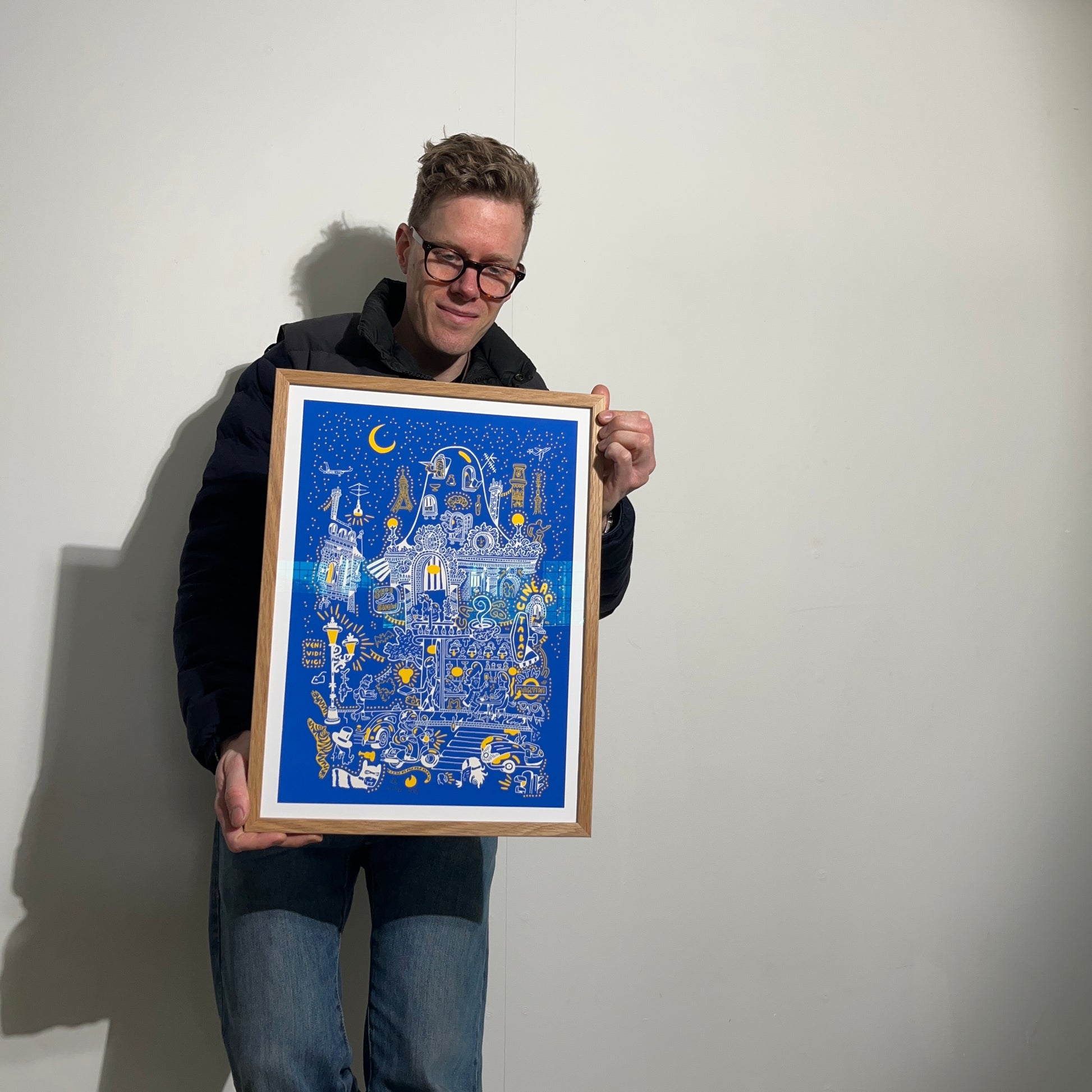 Lækkert syrefrit håndlavet silketryk i tre farver. Håndindrammet i egetræ. UV Museumsglas. Klar til ophængning på væggen.