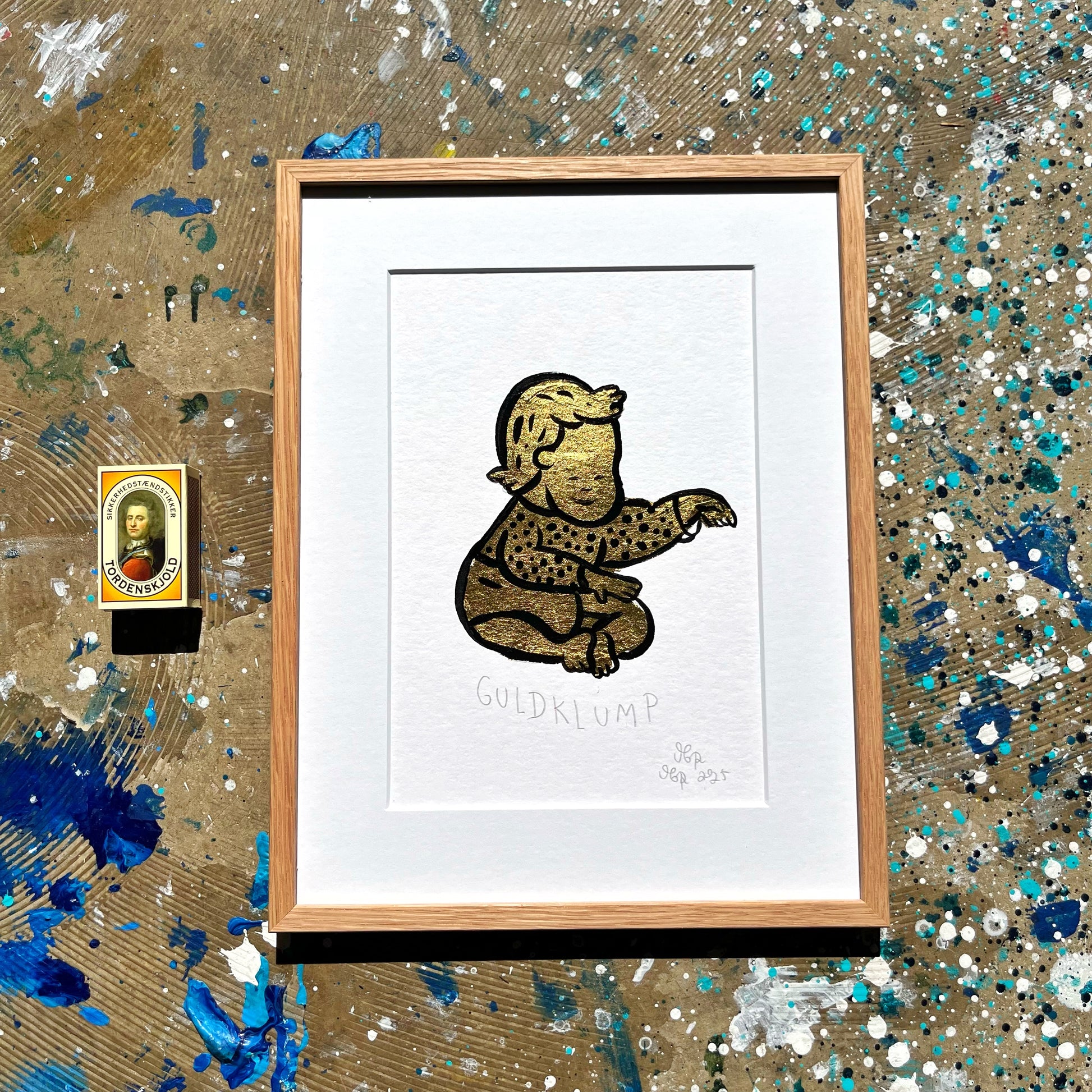 Unika værk lavet med 23,75 karat bladguld. Monteret på 400 g syrefrit Hahnemühle papir. Indrammet i eg og UV Museumsglas.