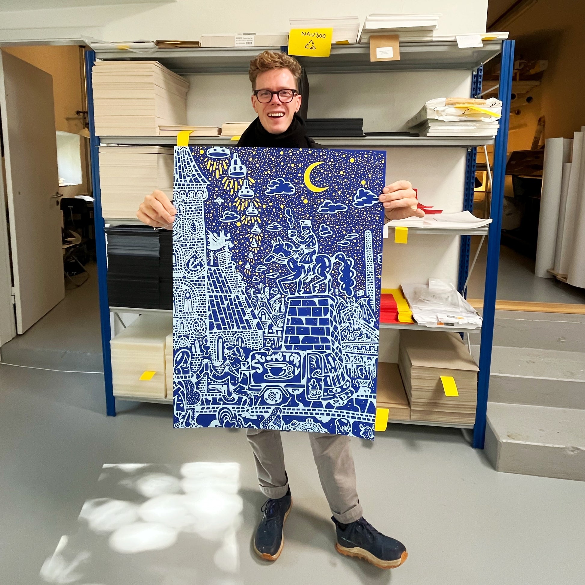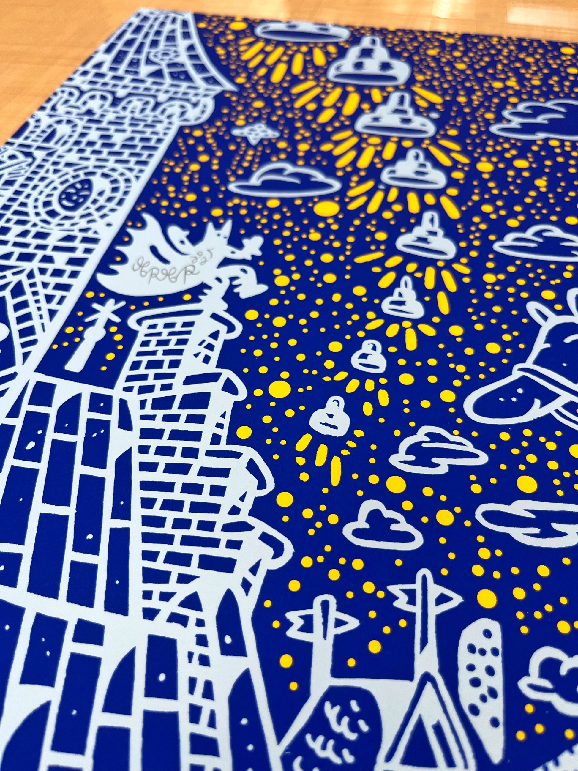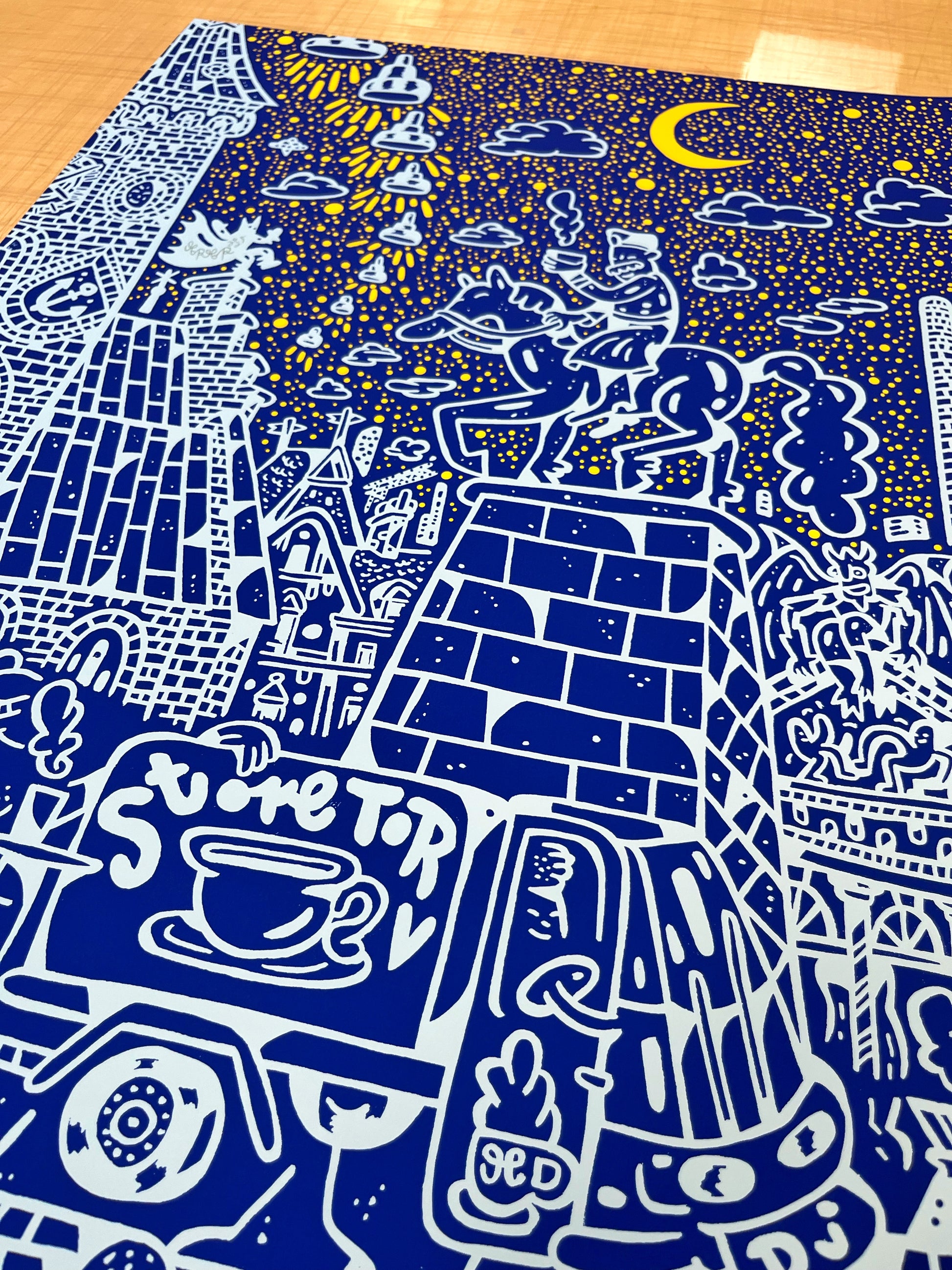 Print i dybe blå farver og gul - på syrefrit Hahnemühlepapir. Underskrevet og nummereret i hånden af mig. Printet professionelt hos Plotteriet i Aarhus.