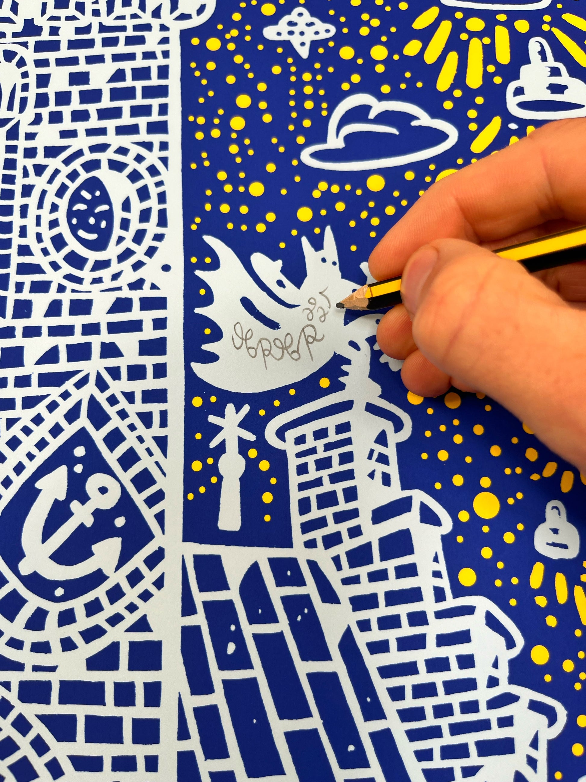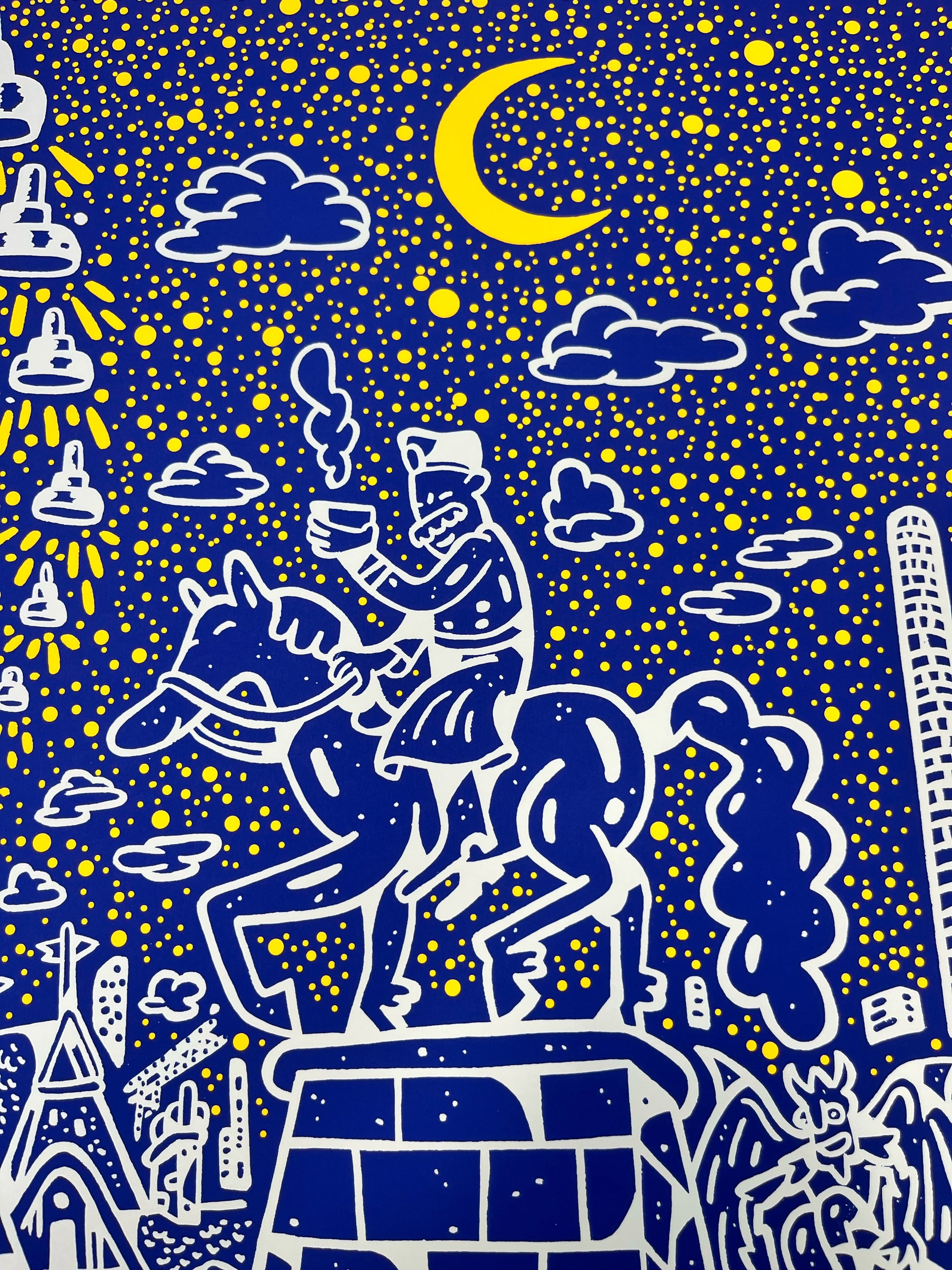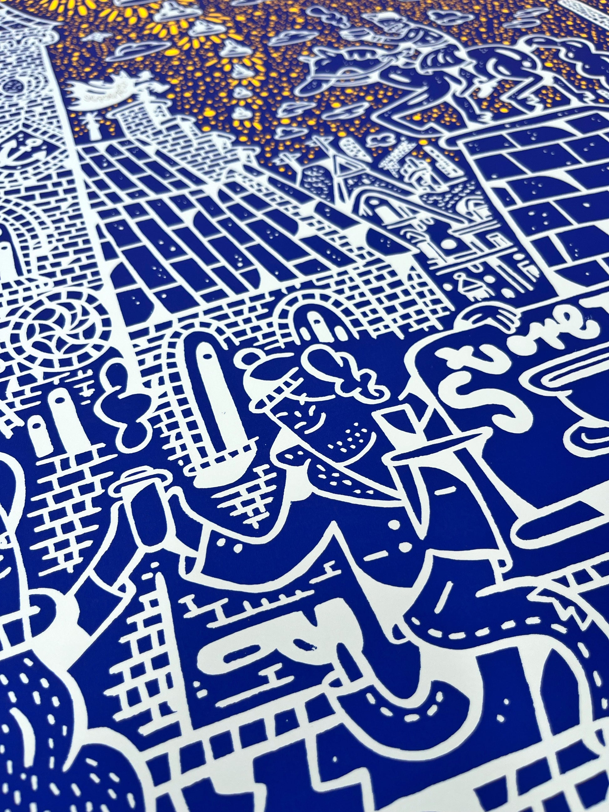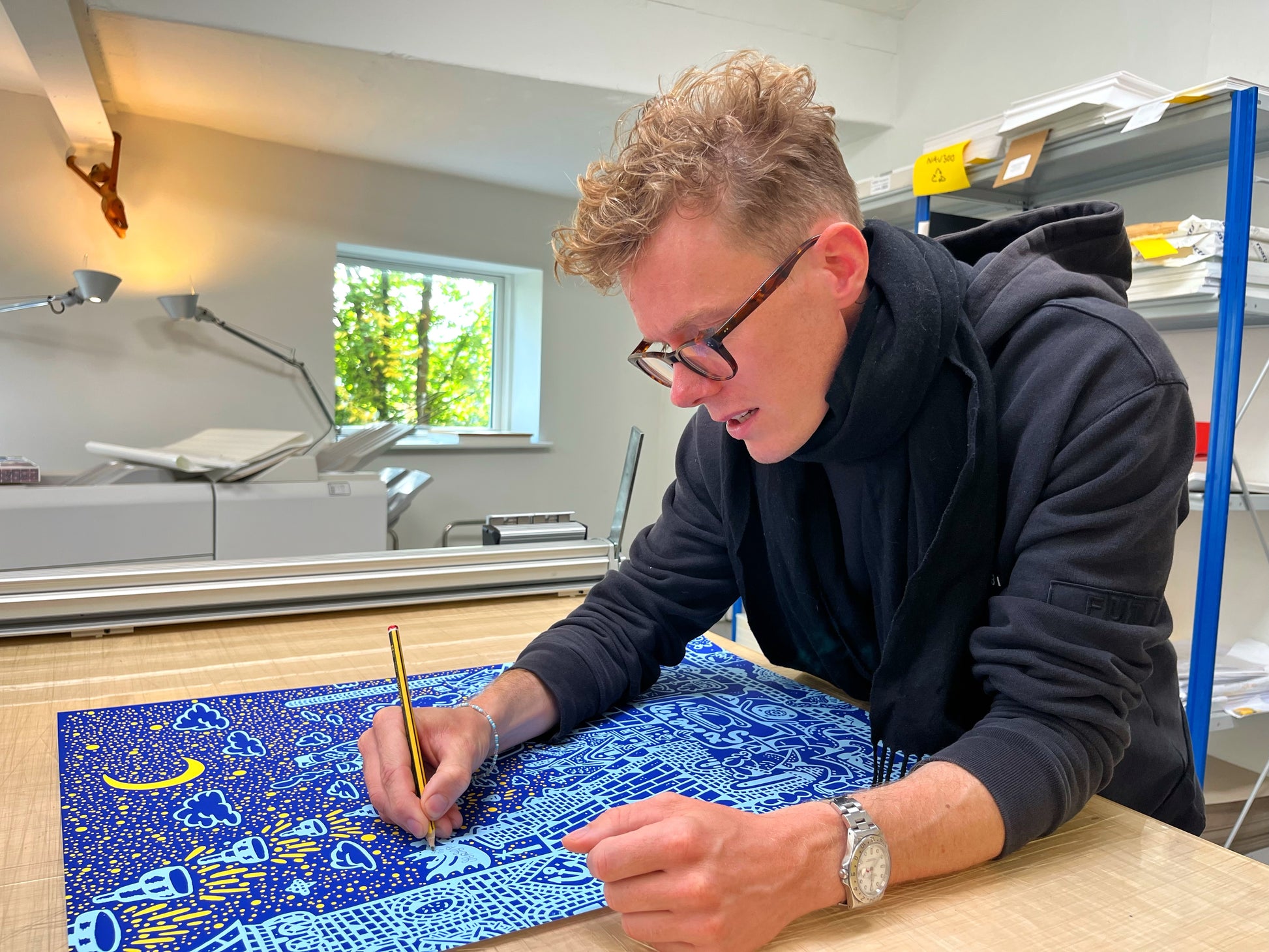 Print i dybe blå farver og gul - på syrefrit Hahnemühlepapir. Underskrevet og nummereret i hånden af mig. Printet professionelt hos Plotteriet i Aarhus.