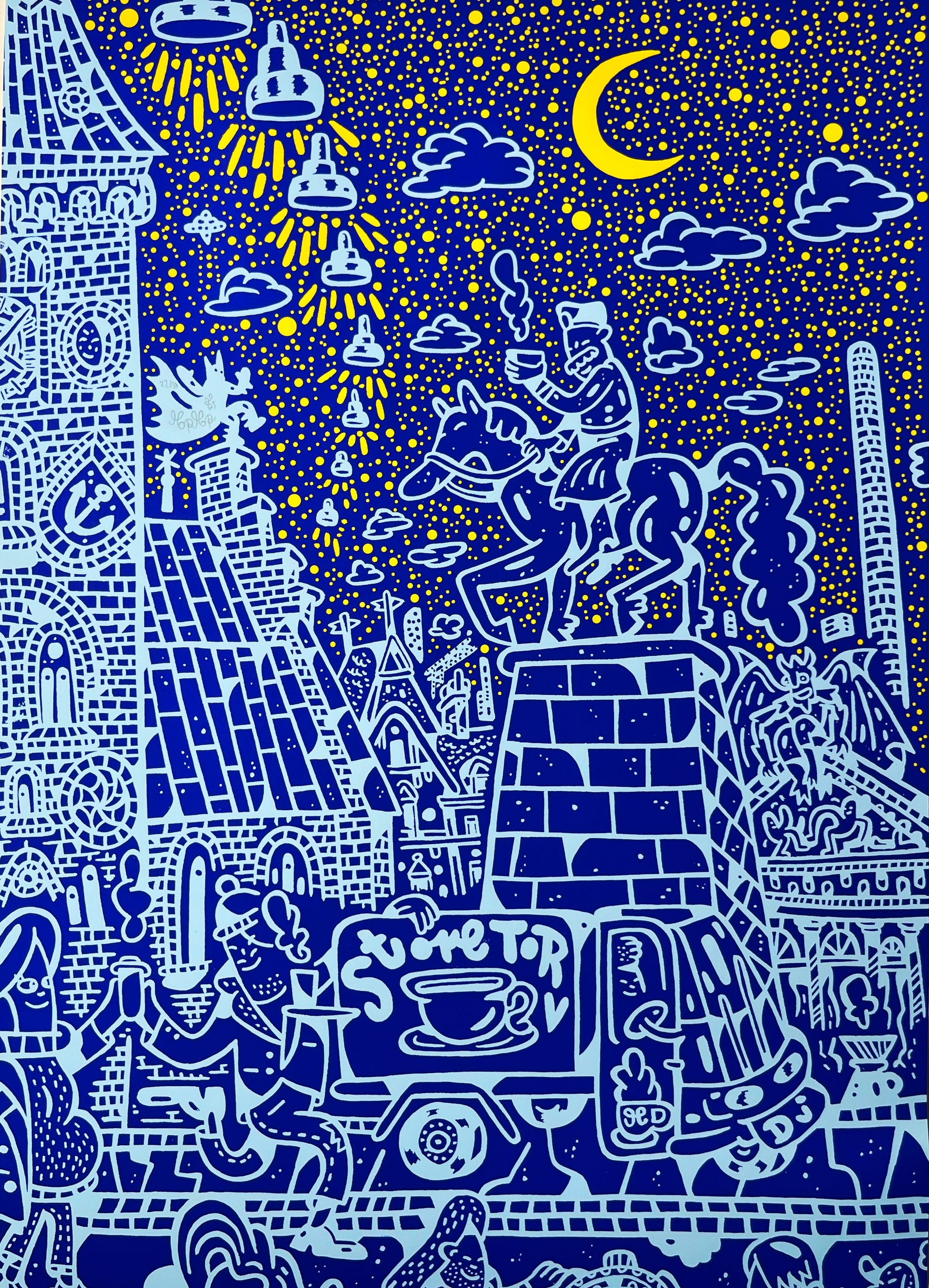 70x50 cm print i dybe blå farver og gul - på syrefrit Hahnemühlepapir. Underskrevet i hånden af mig.