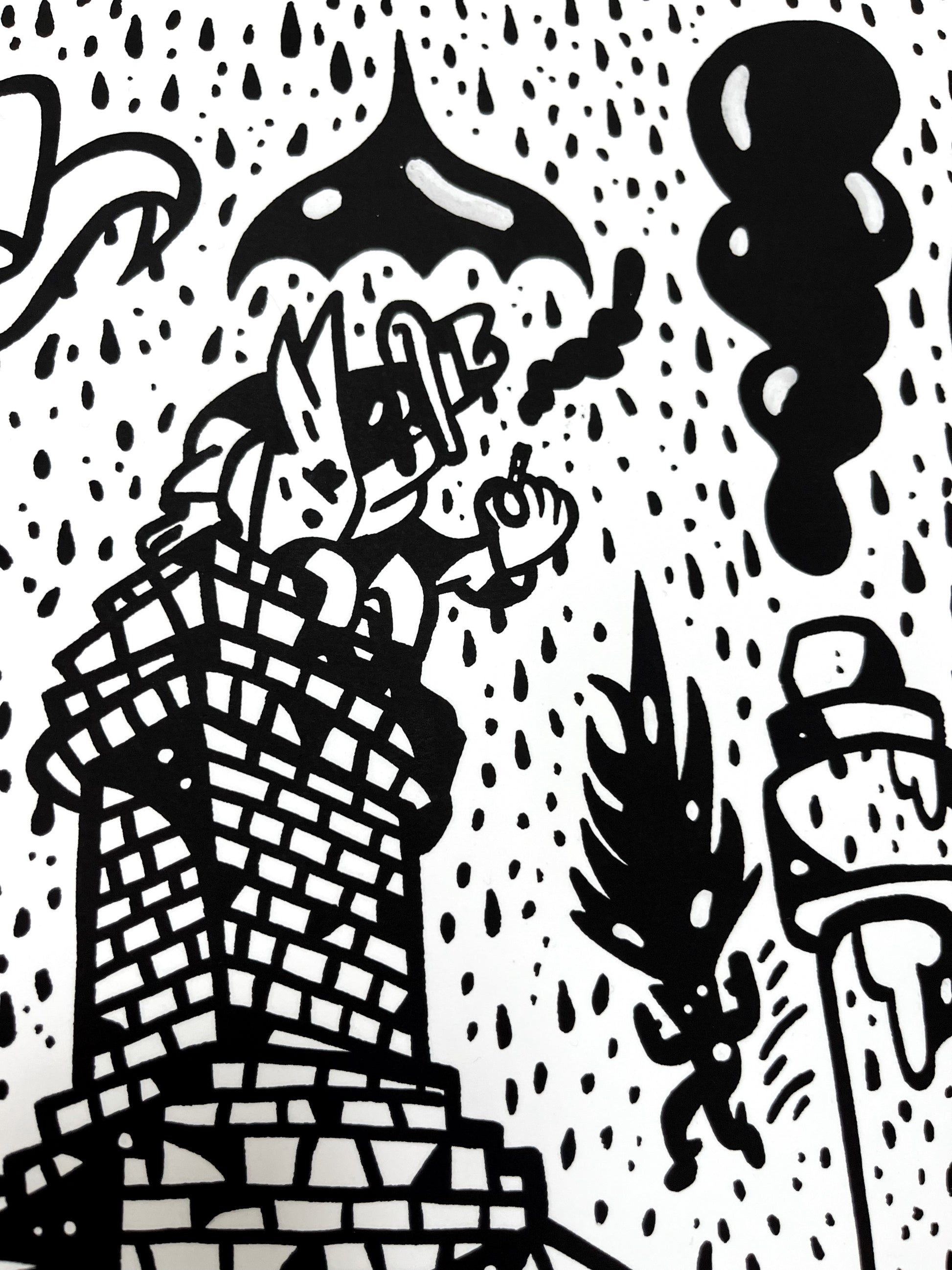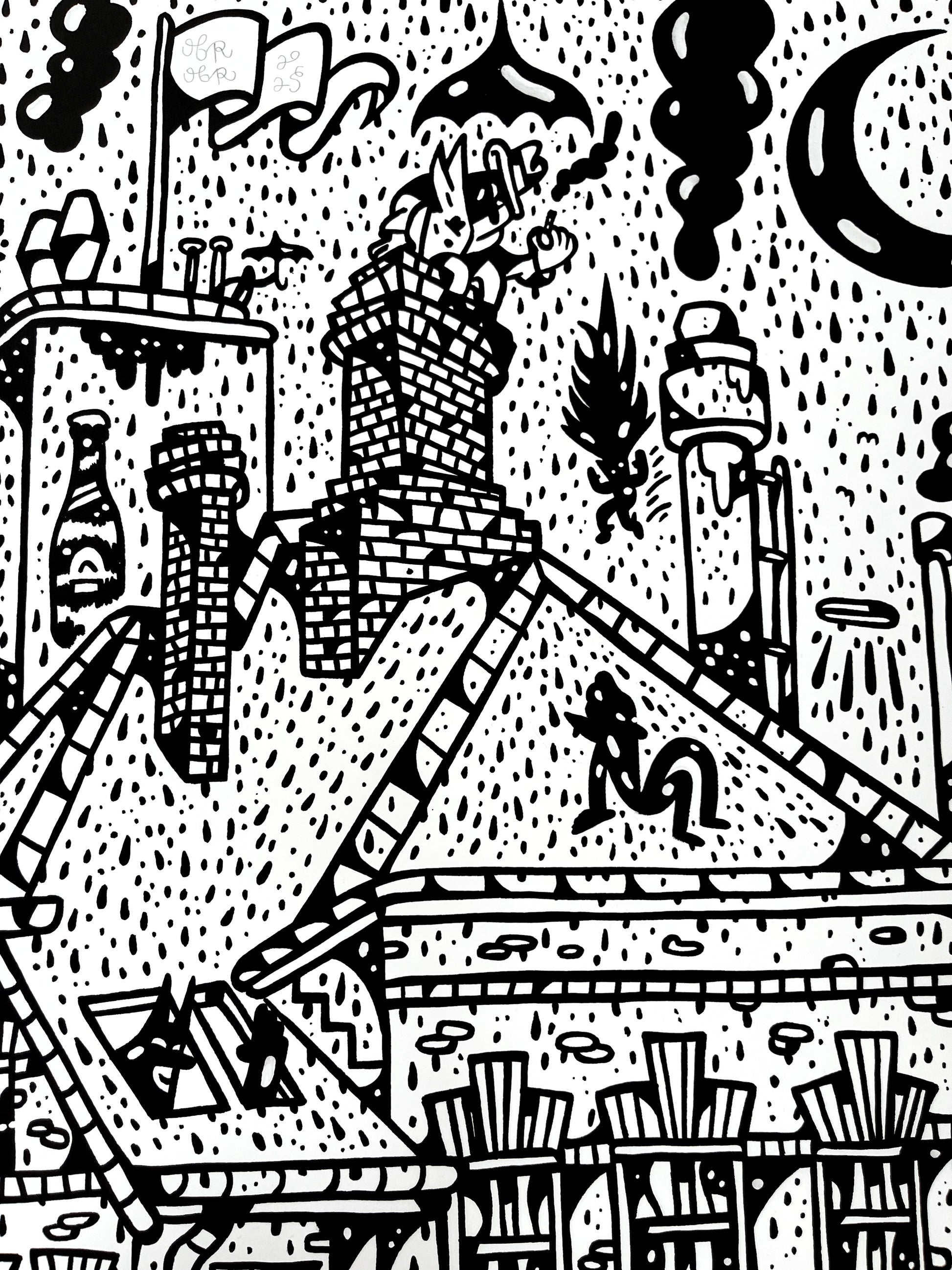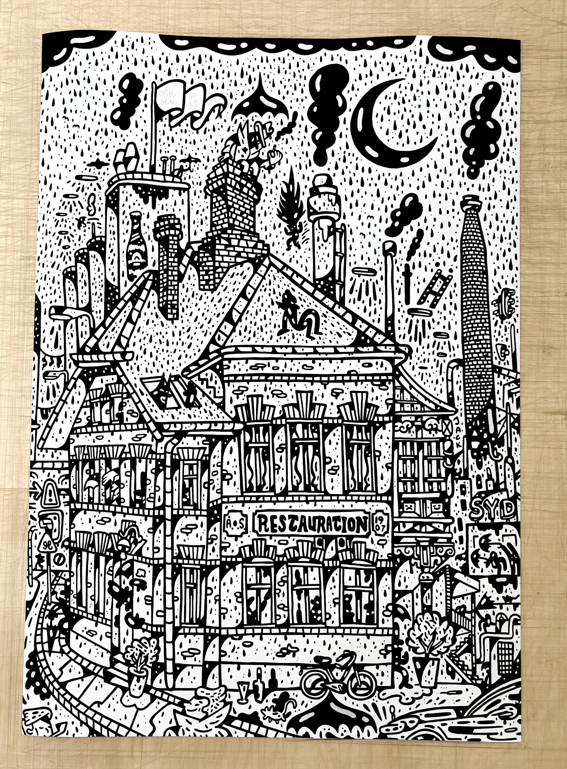 Den gamle ikoniske Restaurant Kohalen spiller også en central rolle i værket og står stemningsfuldt i den silende sort hvide noir regn.