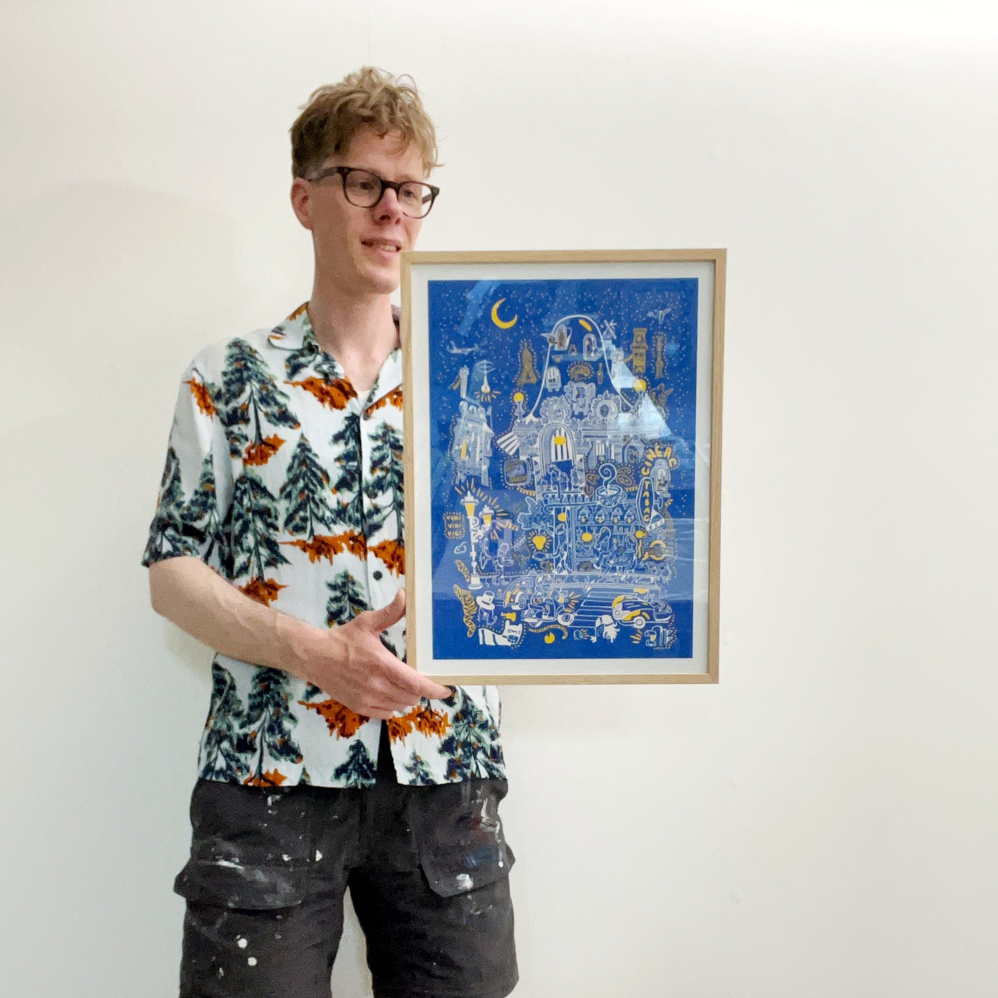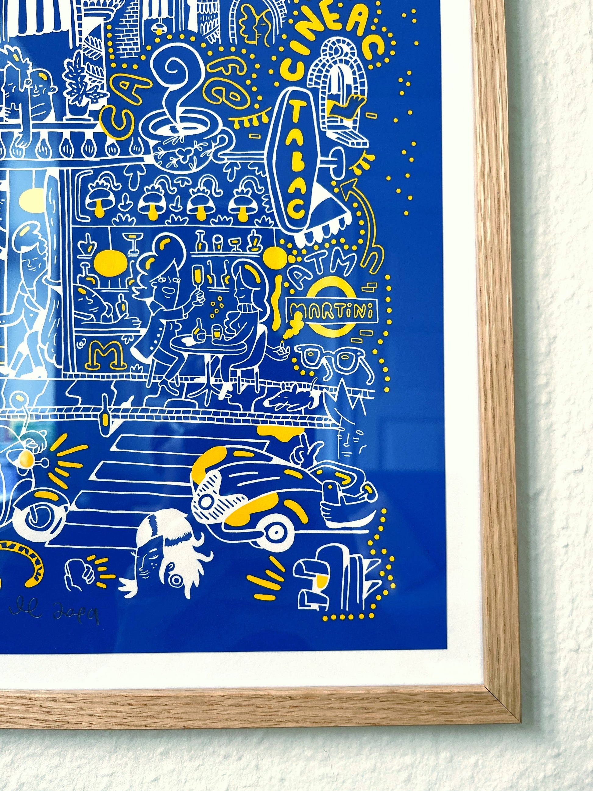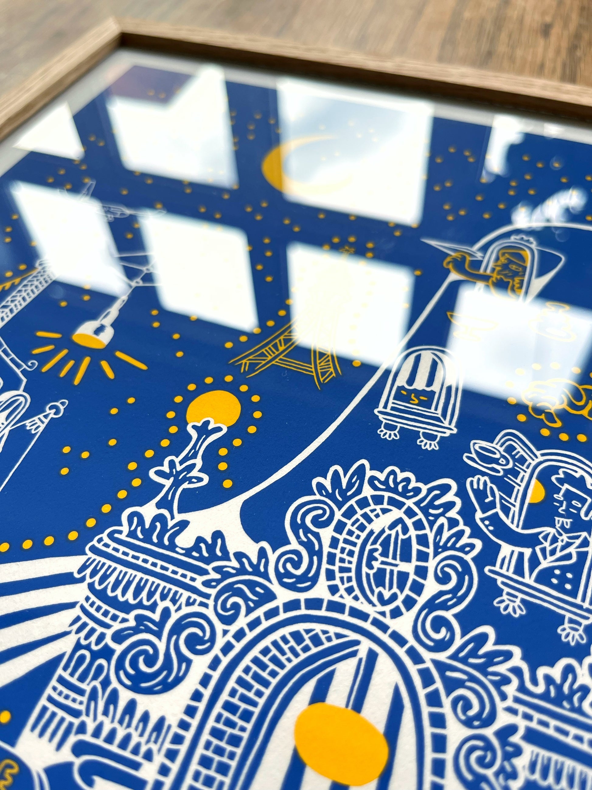 Lækkert syrefrit håndlavet silketryk i tre farver. Håndindrammet i egetræ. UV Museumsglas. Klar til ophængning på væggen.